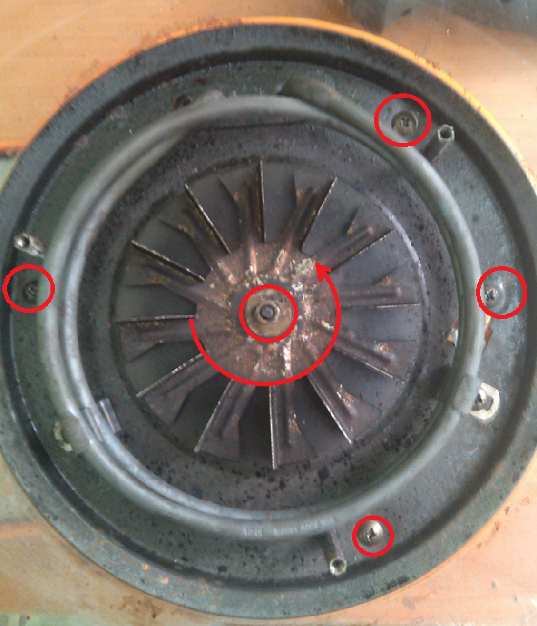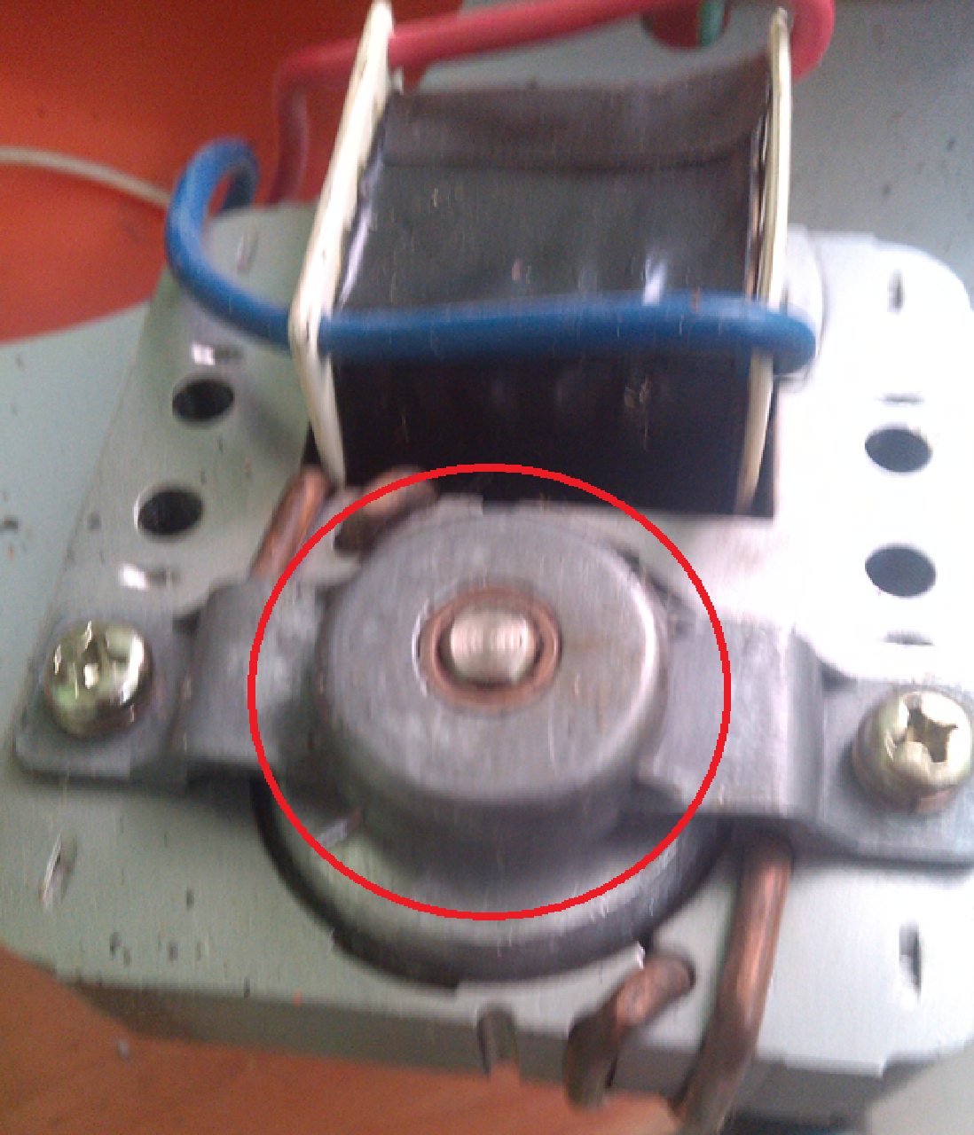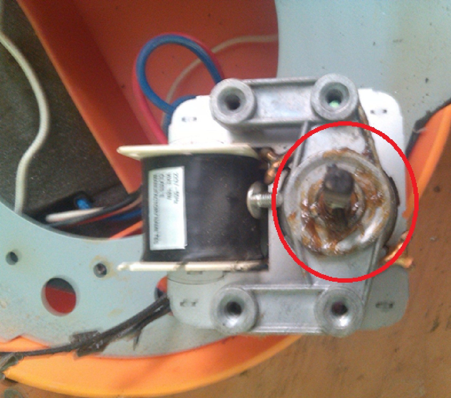 Одной из возможных причин, по которым двигатель и, соответственно, вентилятор крутится медленно или вообще не вращается, может быть попадание жира на его вал. После застывания жир препятствует нормальной работе двигателя. Это можно рассмотреть на снимке. Поэтому и слышится гул: двигатель не справляется с нагрузкой и его обмотка начинает гудеть.