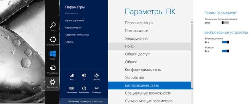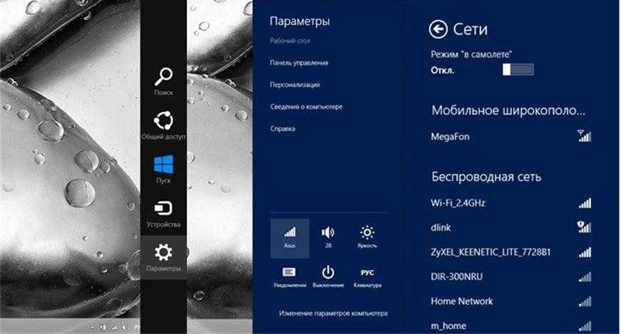 Для вызова дополнительной панели – тоже является изюминкой — нажимаем на правую сторону рабочего стола. И для подключения беспроводной точке – поэтапно переходим по ярлыкам:
