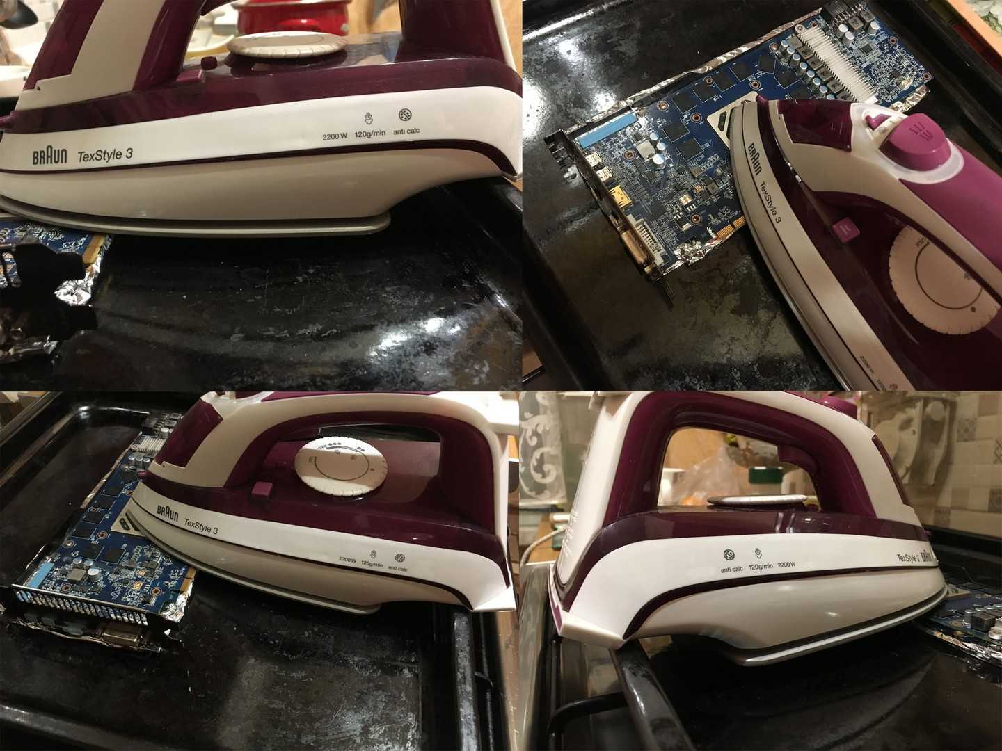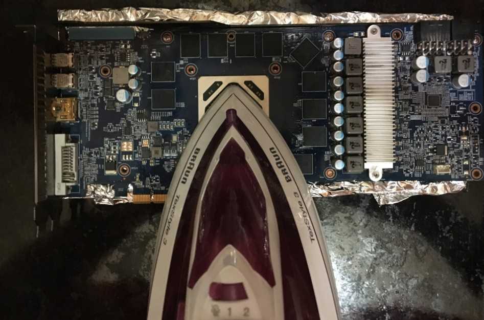 Прогрев видеокарты позволяет припаять «отвалившиеся» элементы обратно, тем самым вернув устройство к жизни. Выполняется этот процесс специальной паяльной станцией, с заменой некоторых компонентов, однако в домашних условиях выполнить это практически нереально. Поэтому давайте детально разберем прогрев с помощью строительного фена или утюга.
