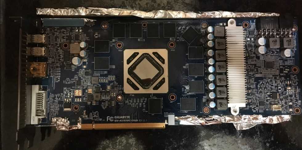 - Теперь необходимо обернуть видеокарту фольгой так, чтобы печатная плата была полностью прикрыта. Иначе высокая температура расплавит текстолит и адаптер придет в негодность. А вот сам чип нужно оставить открытым.
