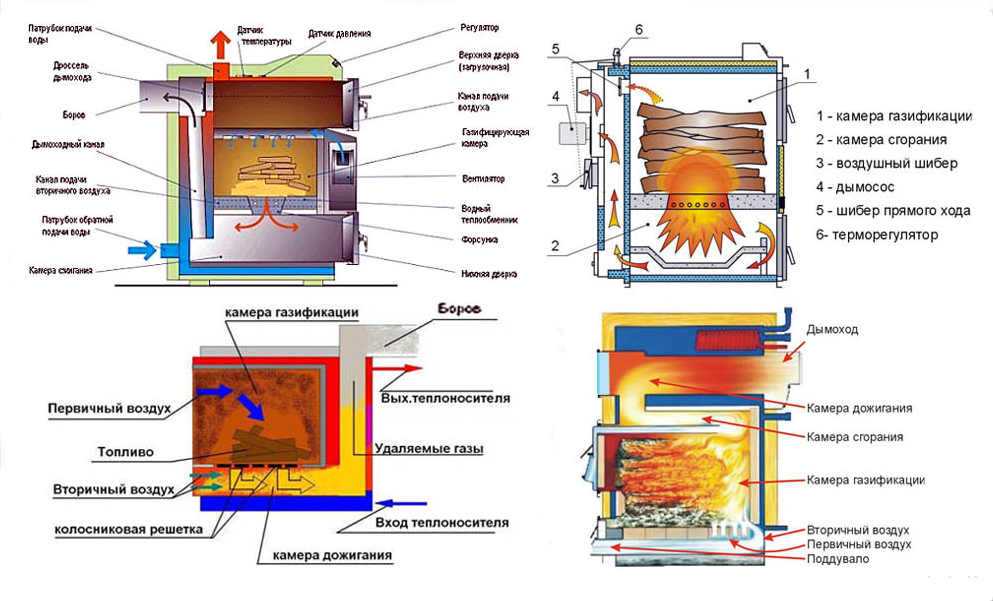 Точно так же в топку загружают большое количество твердого топлива низкой влажности, воздух нагнетают принудительно и обеспечивают тление топлива при пониженном количестве кислорода. Задвижку, которая регулирует поток кислорода, устанавливают в нужном положении.