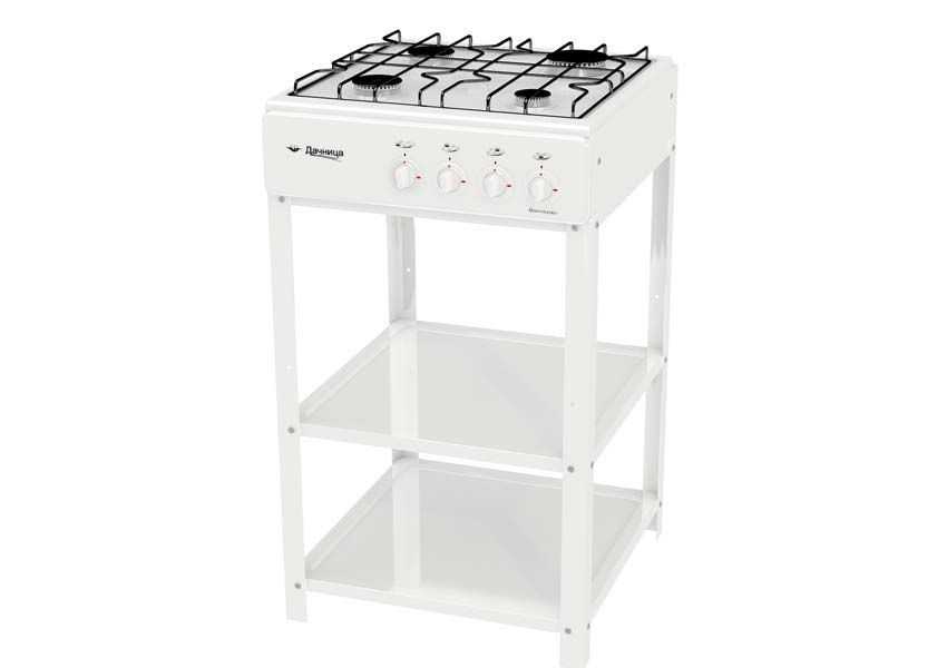 Газовая плита «Дачница» привлекает небольшой стоимостью. Полки пригодятся для хранения посуды, кухонного инвентаря