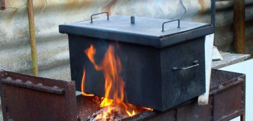 Для образования стойкого дыма яму нужно накрыть листом из металла или чем-то другим, плотно прилегающем к поверхности. Холодильник с уже подготовленными продуктами плотно закрывается. После этого происходит процесс копчения;