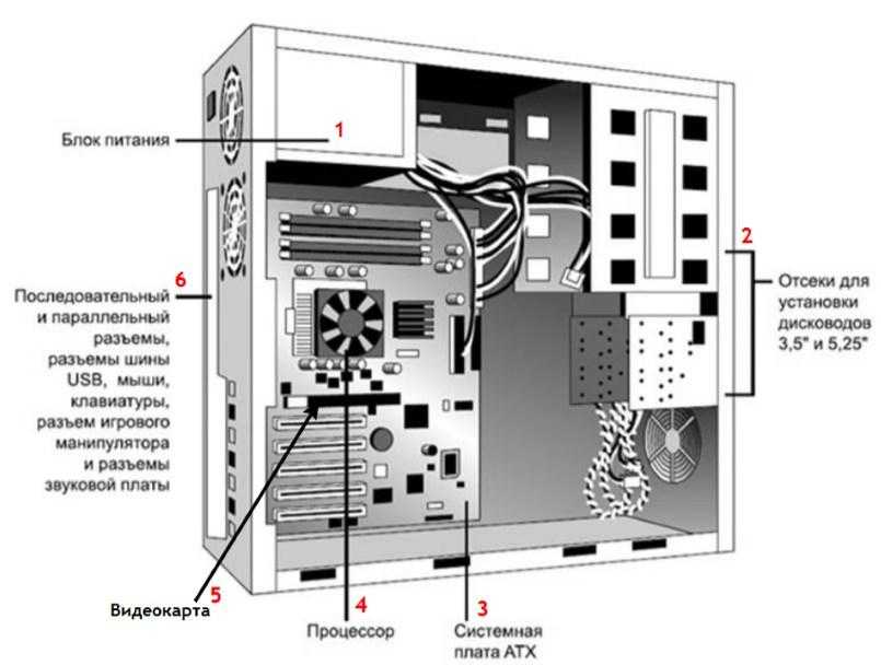 Давайте пройдемся и разберем каждый параметр в отдельности, но сначала вживую определимся с основными конструктивными отсеками/отделами практически любого корпуса. Собственно, сняв крышку своего системного блока, можно обнаружить внутри много пыли следующие ниши для установки компьютерных элементов (см. изображение).
