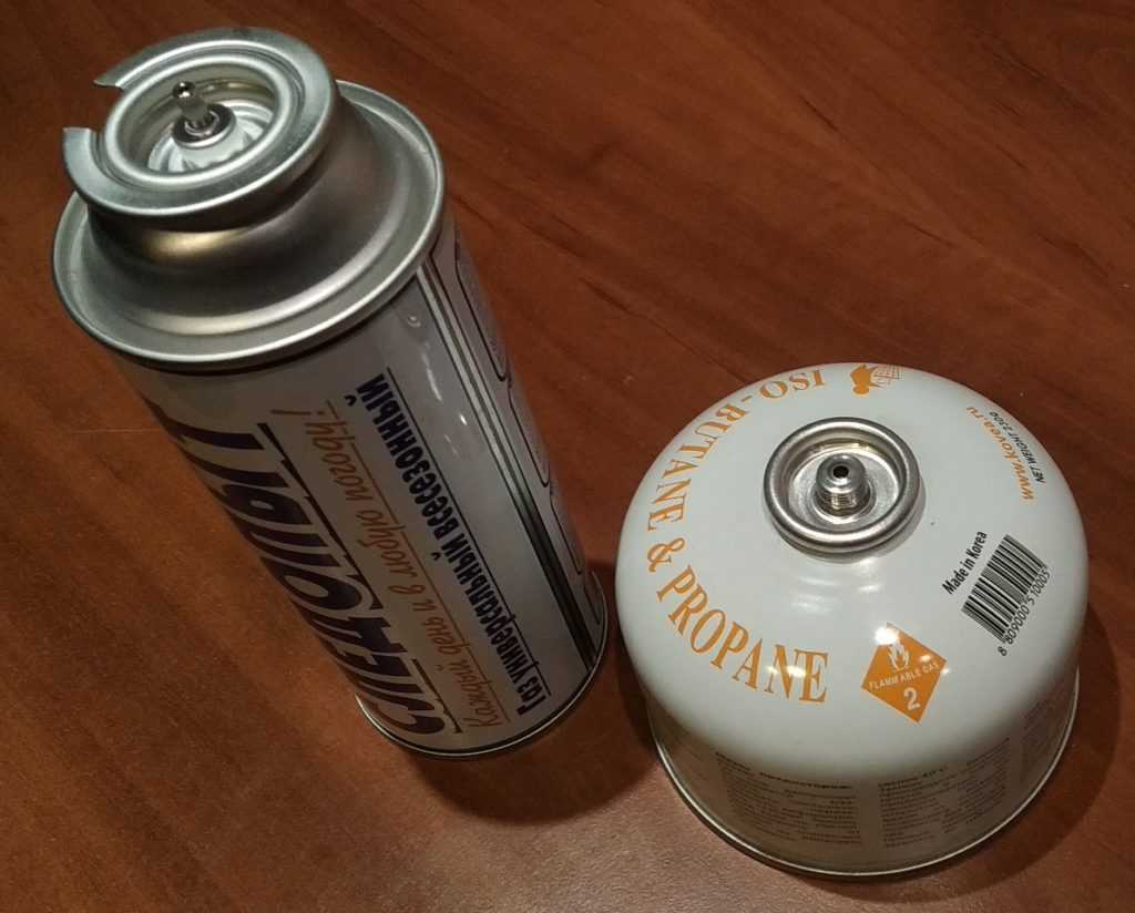 Резьбовые. Баллоны с резьбой более низкие, с широким основанием, что делает конструкцию устойчивой – при накрученном баллоне горелка надежно стоит на земле. Кроме того, резьбовые системы можно перезаправлять, и даже переливать газ из одного баллона в другой. (Не рекомендовано производителями оборудования, но среди туристов используется повсеместно. Случаются ситуации, когда большой группе необходим запас в 5-6 кг газа, а туристических магазинов рядом нет. Приходится заправлять баллоны от бытовых емкостей через переходники).