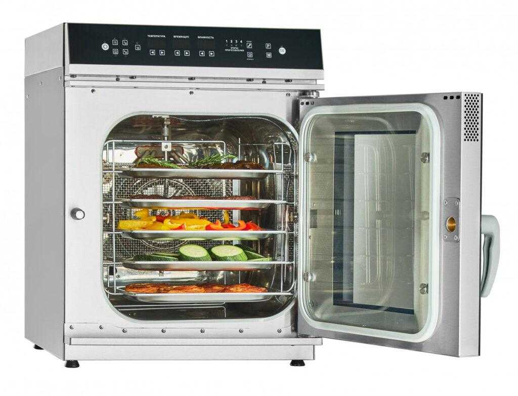 - Возможность приготовления небольшого количества еды – если не нуждаетесь в производстве промышленных масштабов, вас порадует мини-пароконвектомат. Он способен приготовить вполне вкусные блюда в небольшом количестве, например, для маленького магазина, большой семьи или крохотного уютного кафе.