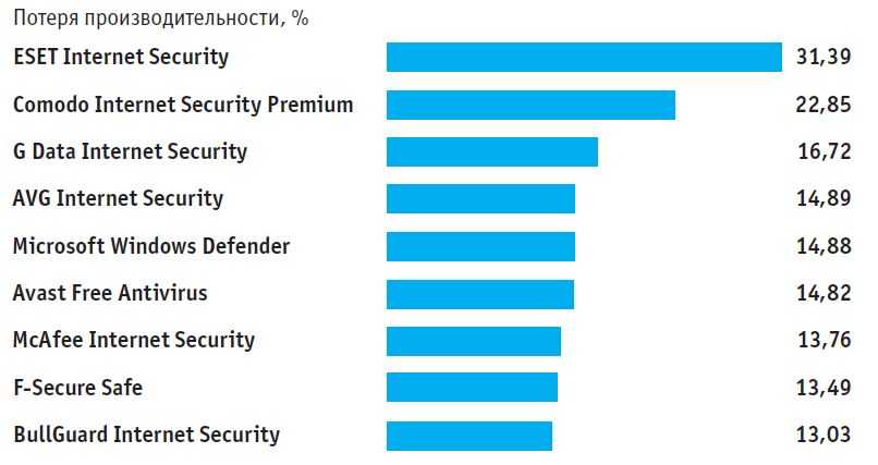 Защита в фоновом режиме влияет на производительность ПК. На графике представлены самые замедляющие продукты из нашего рейтинга
