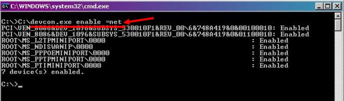 - Откроется командная строка, наберите команду devcon enable ID (вместо ИД прописываем номер вашего Блютуз);