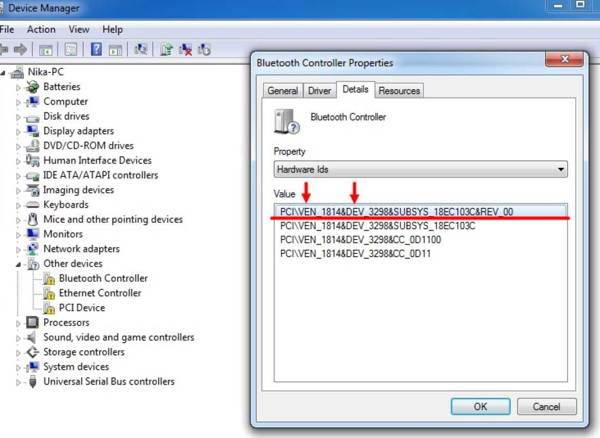 - Узнать ИД адаптера. В «Диспетчере устройств» найдите адаптер Блютуз, кликните правой кнопкой – затем «Свойства». На вкладке «Сведения» переключитесь на «ИД оборудования». Запишите значение. VEN – идентификатор производителя, DEV – оборудования.