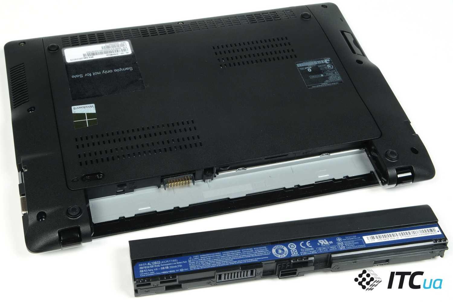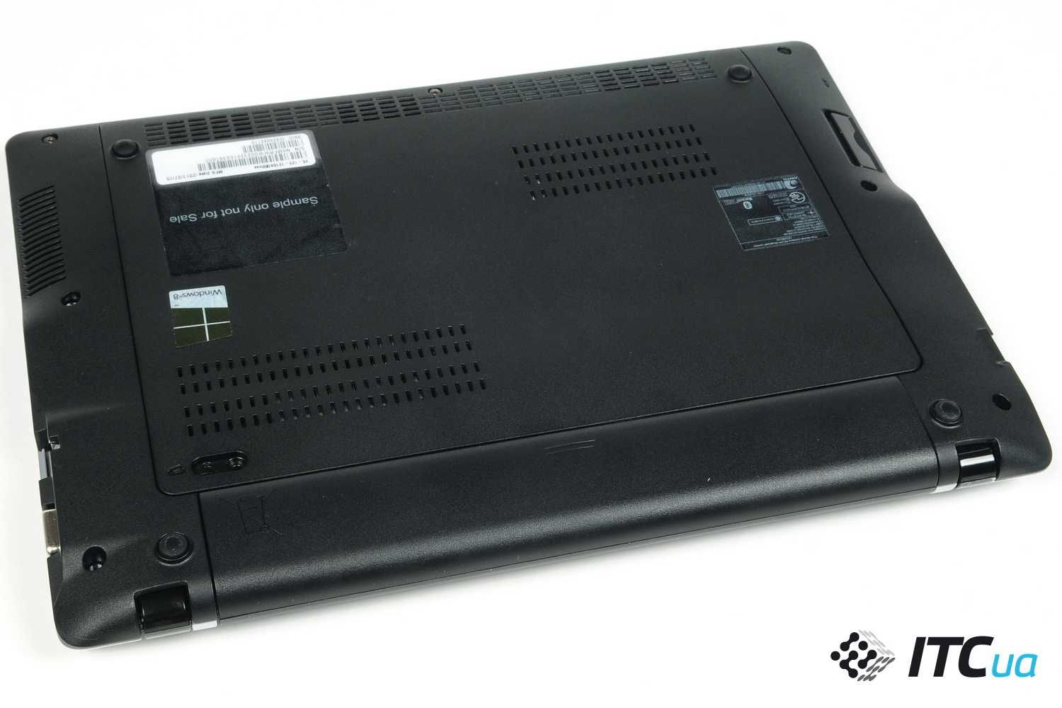 Нижняя часть корпуса Acer Aspire V5 изготовлена из практичного шероховатого пластика черного цвета. Дальняя часть выделена под отсек съемного аккумулятора емкостью 37 Втч, при этом чтобы сдвинуть фиксатор потребуется воспользоваться ручкой или другим тонким предметом. Большую часть нижней части корпуса занимает люк для апгрейда, усеянный отверстиями для вентиляции. Через ближние к передней кромке отверстия хорошо просматривается пара динамиков.