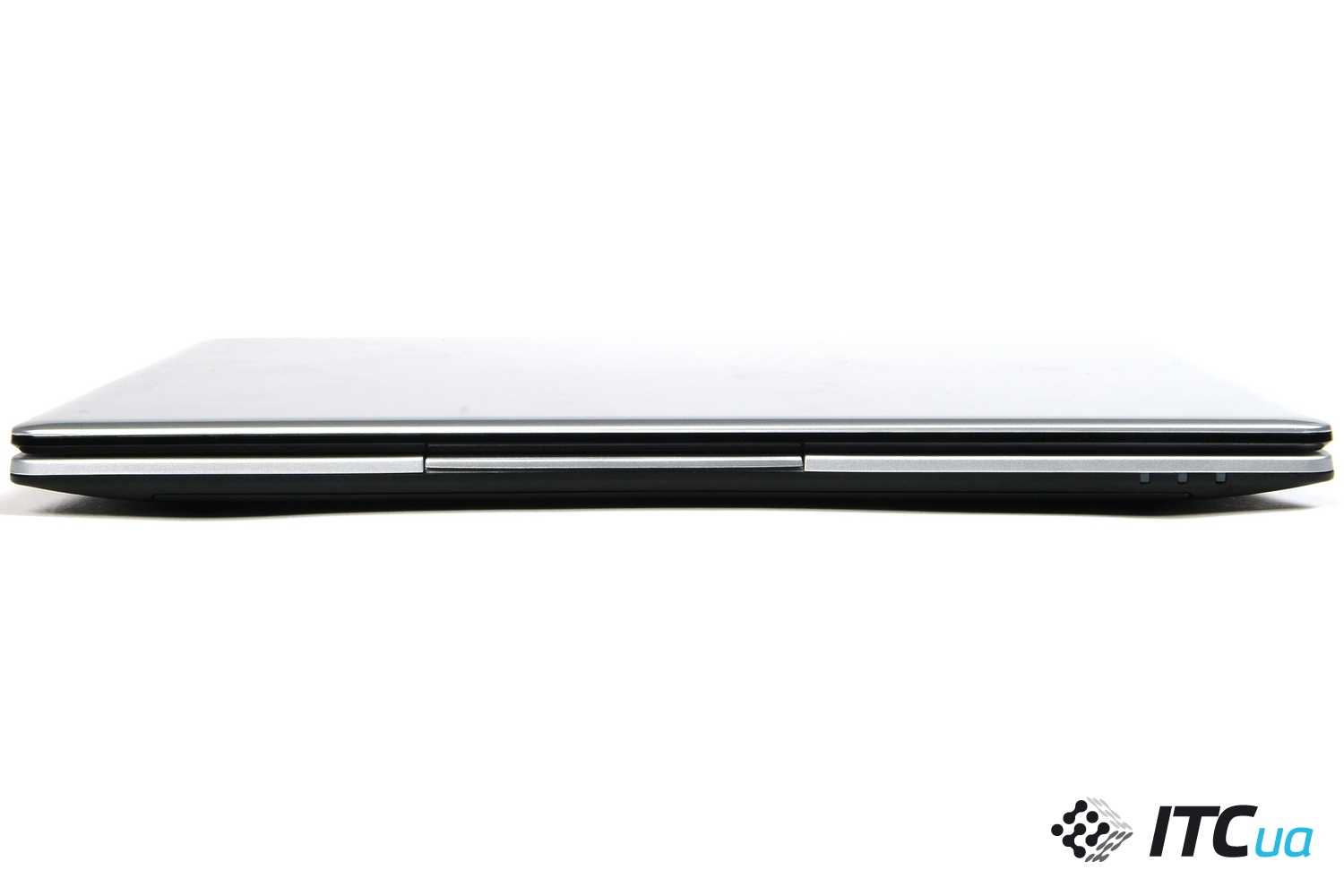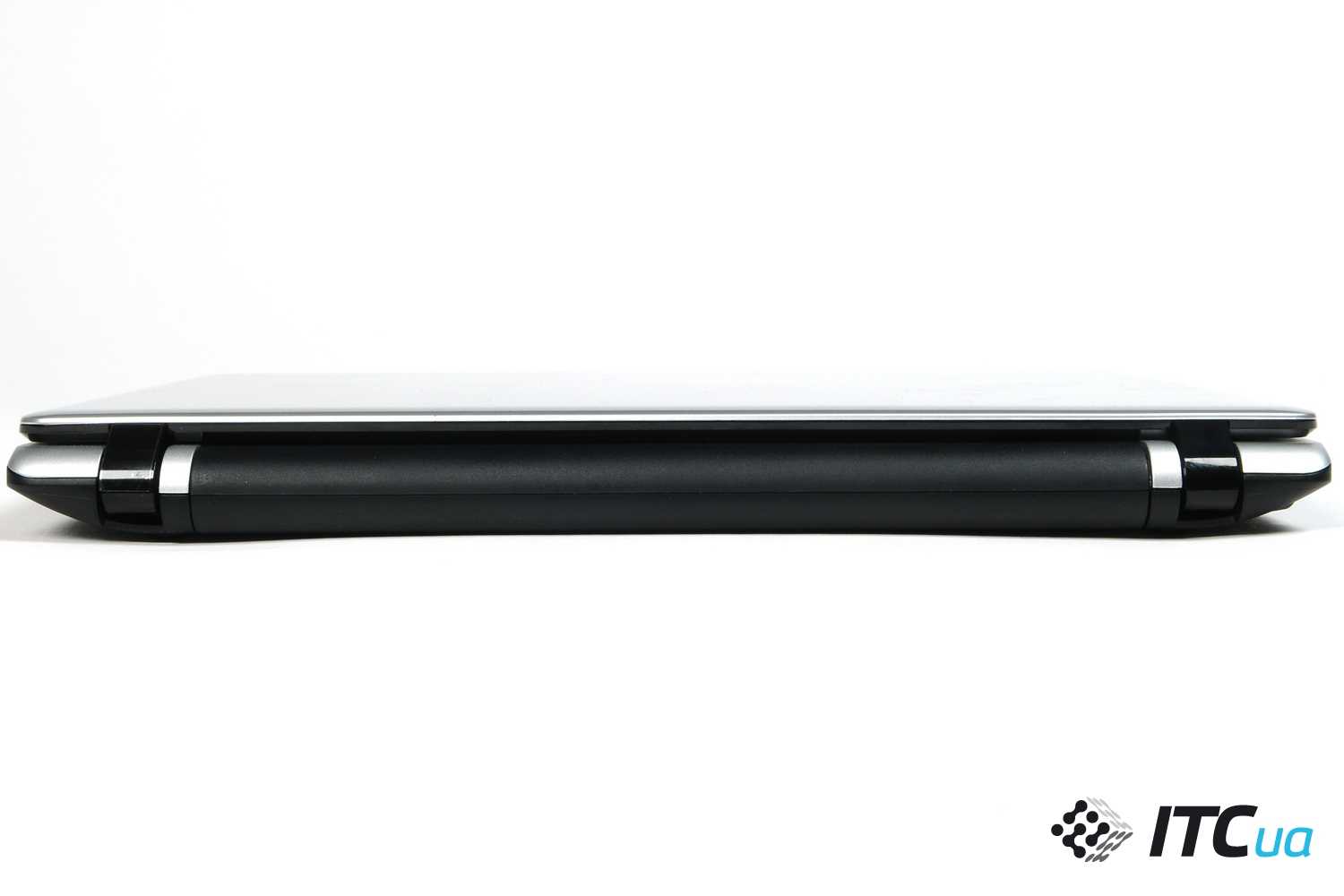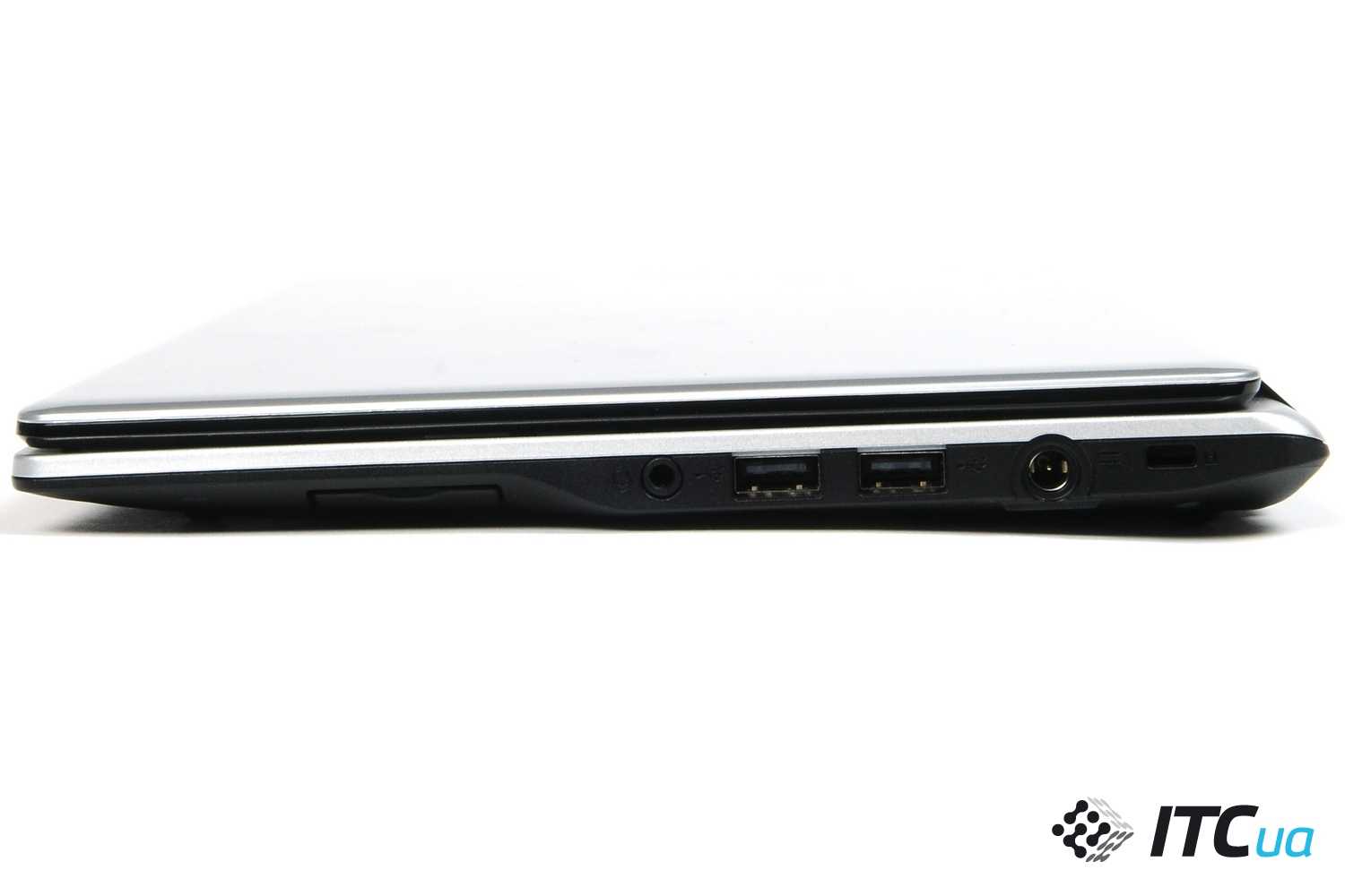 Задняя грань корпуса Acer Aspire V5 свободна от разъемов, на переднюю вынесены три индикатора активности и кромка единственной клавиши тачпада. На правой боковине можно найти отверстие под замок Кенсингтона, гнездо зарядного устройства, пара разъемов USB 2.0, совмещенный аудиопорт и практически невидимый из-за скругления боковины кард-ридер с заглушкой-салазками. Левая боковина содержит видеовыход D-sub, сетевой RJ45, еще один видеовыход HDMI и “быстрый” порт USB 3.0. На тот же изгиб вблизи фронтальной панели вынесен радиатор системы охлаждения.