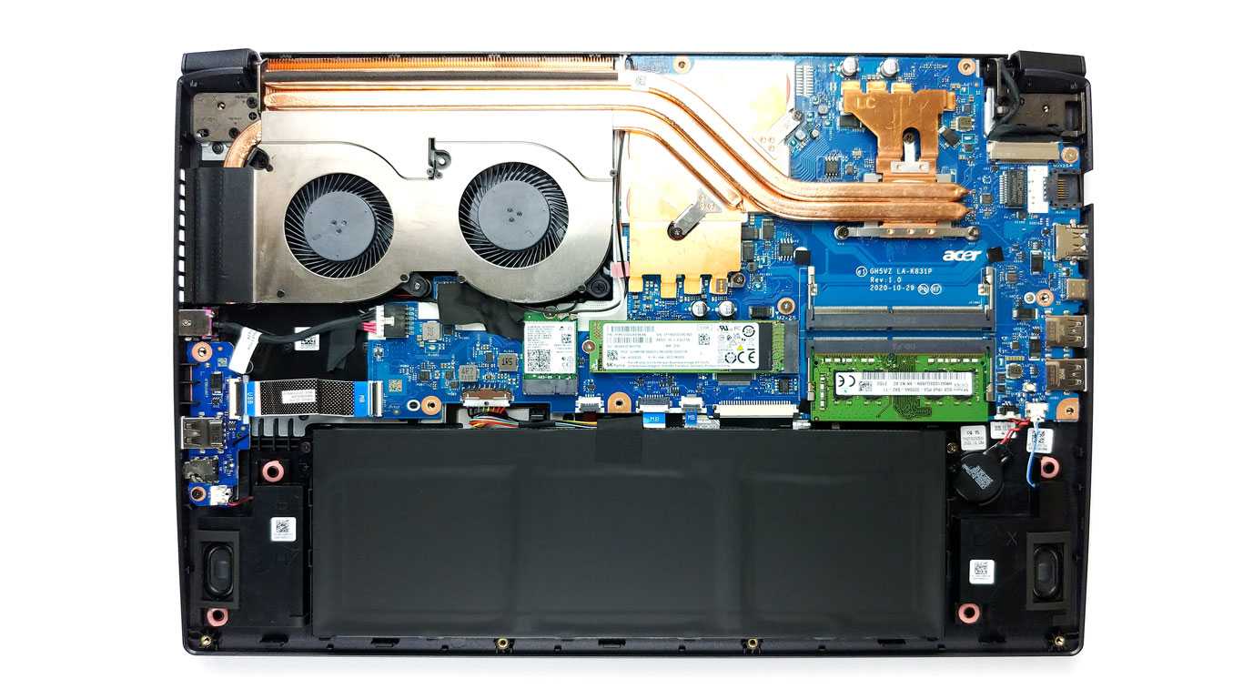 На нижней крышке есть отверстия системы охлаждения и три резиновые ножки, которые обеспечивают хорошее сцепление со столешницей. Для доступа к аппаратной платформе необходимо полностью снимать крышку. Возможности апгрейда у Acer Aspire 7 A715-42G такие же, как и у аналога Aspire 7 A715-75G с процессорами Intel. На материнской плате есть только два DIMM-слота и один слот M.2 для накопителя.