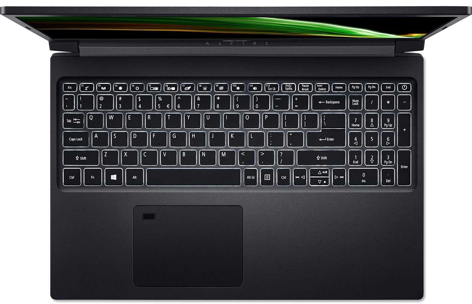 В Acer Aspire 7 A715-42G используется хорошо знакомая полноразмерная (338 х 98 мм) клавиатура островного типа с дополнительным цифровым блоком. Есть привычный ряд полезных функциональных действий, которые исполняются по умолчанию. Для использования клавиш необходимо нажимать их в сочетании с кнопкой . Кнопки оснащены одноуровневой подсветкой белого цвета. Яркость подсветки подобрана так, что гравировка на клавишах хорошо видна и днем, и ночью. Плоские и гладкие клавиши обладают коротким ходом и четким откликом. Усилие нажатия ощутимое, при наборе клавиатура не прогибается. К сенсорной панели никаких претензий у меня не возникло — она не такая маленькая, как в 13- и 14-дюймовых ультрабуках. Пальцы хорошо скользят по тачпаду, жесты распознаются нормально, нажатие сопровождается отчетливым и громким щелчком. При этом тачпад оснащен сенсором отпечатка пальцев.