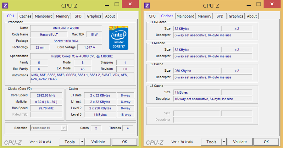 В качестве более производительного решения выступает Intel Core i7 4500U. Он так же двухъядерный, с поддержкой Hyper-Threading (обрабатывает одновременно до четырёх потоков). Каждое из двух ядер имеет тактовую частоту 1.8 ГГц, которая динамически увеличивается (с Turbo Boost) до 3.0 ГГц при одном активном ядре, или до 2.7 ГГц при работе одновременно двух ядер.