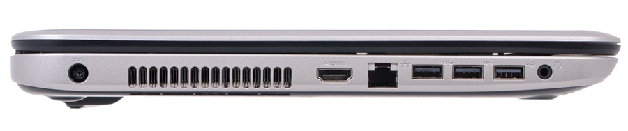 На левой стороне расположились: гнездо зарядного устройства, HDMI, порт проводной сети Ethernet, два USB 3.0 и один USB 2.0, а также комбинированный аудио разъём.