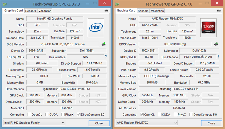 Рисунок 9. Подробные характеристики Intel HD Graphics 4400 и AMD Radeon HD8870m (R9 M270X)