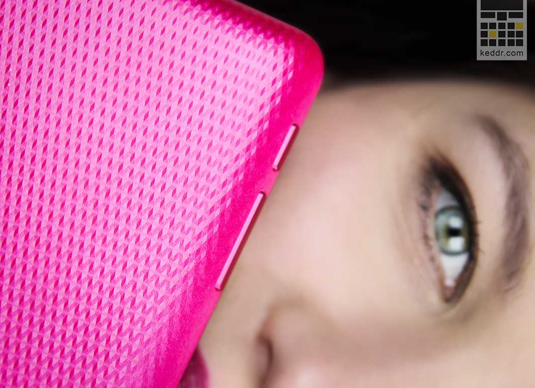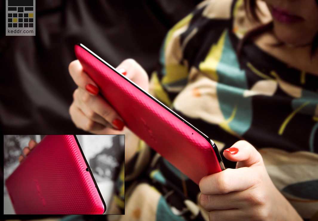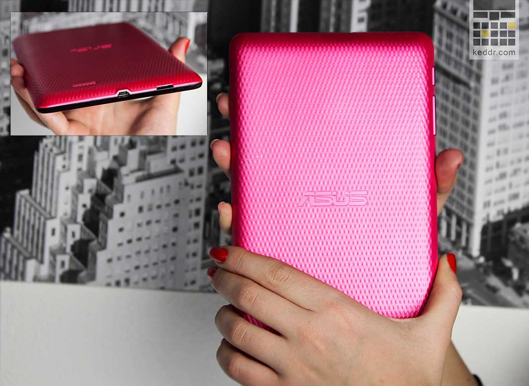 Над дизайном не трудились, это получился практически тот же Nexus 7, но с другим, более дешевым материалом задней крышки. Он получился на 2,5 мм уже, на 1 мм ниже и на 0,5 мм толще старшего брата. А у Acer B1 дизайн мне понравился больше, но материалы и качество сборки куда лучше в Memo Pad. При взаимодействии нет ощущения особой дешевизны, но все же незначительные скрипы и люфты есть, также есть ощущение, что они усилятся. А тем временем у меня начала облазить розовая краска задней крышки. Кстати, доступен аппарат в трех цветовых решениях: розовый (как у нас), белый и черный.