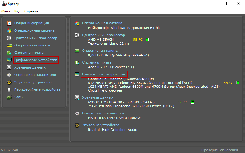 Если требуется получить более подробную информацию, пригодится программа Speccy. В центральной области окна или в левой части интерфейса нажимаем рубрику «Графические устройства».