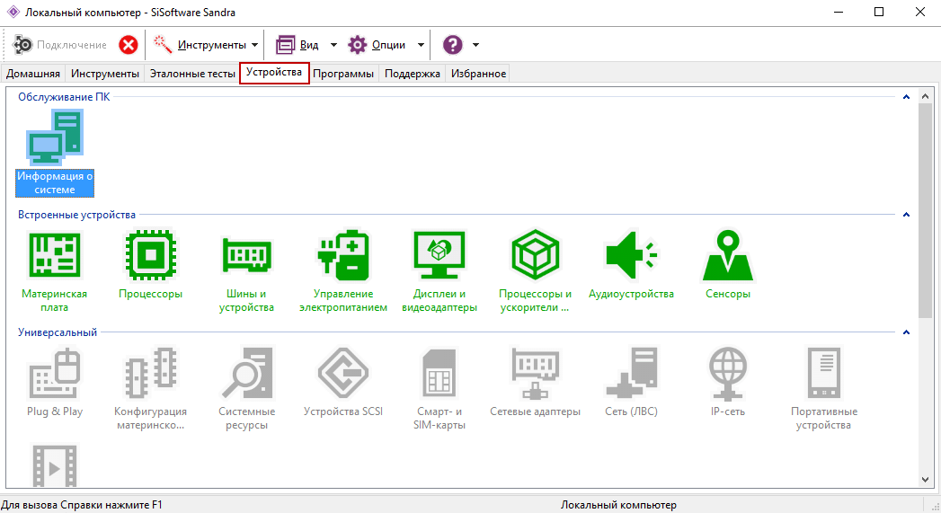 Бесплатное приложение SiSoftware Sandra Lite. Переходим во вкладку «Устройства», активируем ссылку «Информация о системе».