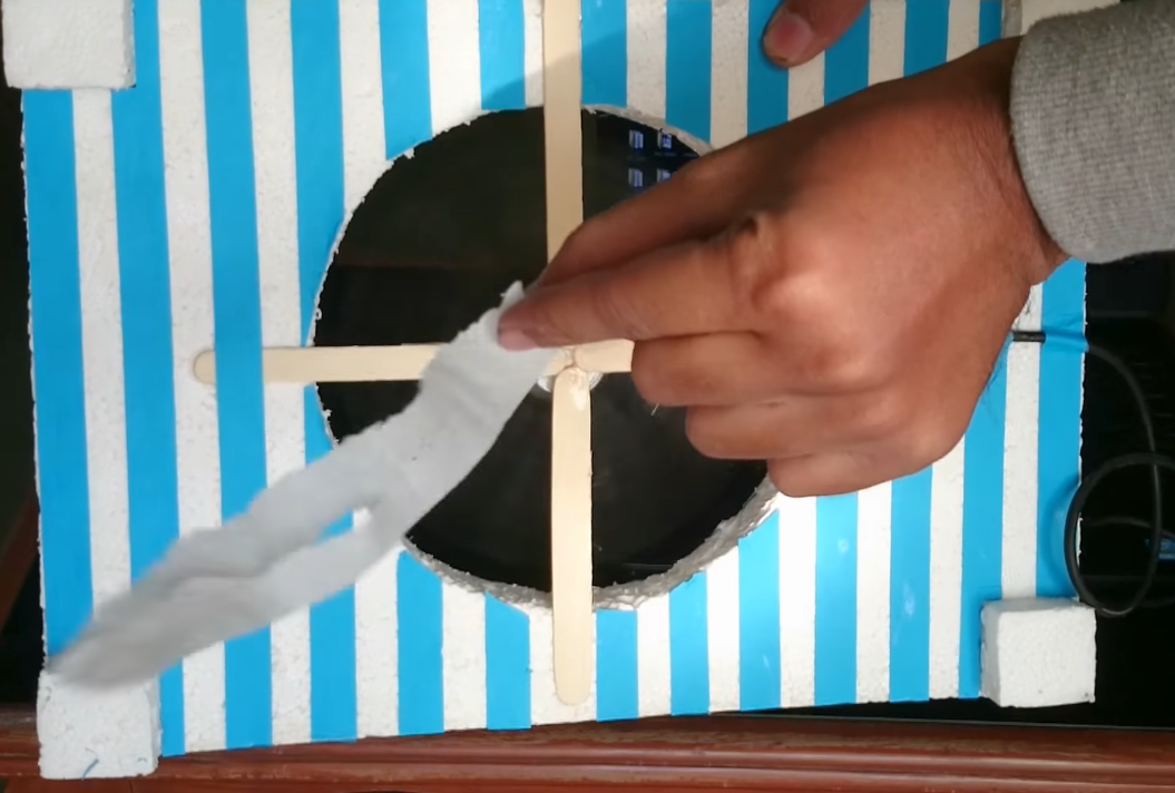 Возьмите 4 палочки для мороженного и закрепите их, чтобы они служили подставкой для вентиляционного элемента. Скреплять палочки между собой можно с помощью обычной клейкой ленты.