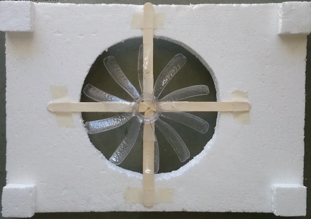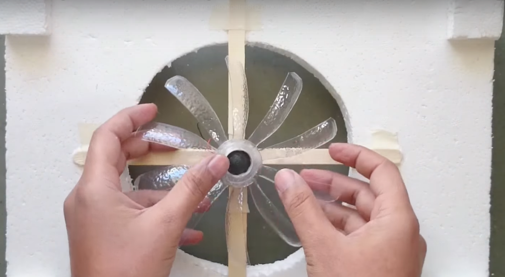 Возьмите простой механизм мотора (есть в любом магазине радиоэлектроники) и прикрепите к его внешней стороне крышку от бутылки. Расположите получившуюся деталь в центр лопастей: