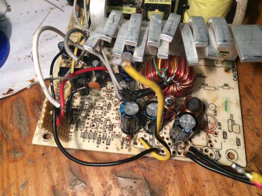 Случается, что импульсный блок питания начинает нормально работать только будучи отключенным от основной платы. К примеру, блок питания компьютера включается лишь тогда, когда его отключают от материнской платы и «заводят» посредством перемычки, которая соединяет зеленый и черный провод. Чтобы найти место или радиоэлемент, который провоцирует короткое замыкание, необходимо затратить очень много времени. Для максимального упрощения этой задачи рекомендуем подать на проблемную линию в материнской плате постоянное напряжение с ограничением тока от лабораторного блока питания. С помощью прикосновений, а также при помощи факсимильной бумаги находим ту область, где имеется наивысший нагрев. Следовательно, именно там и находится неисправный элемент. Поиск и устранение проблемы занимает не более 15 минут.