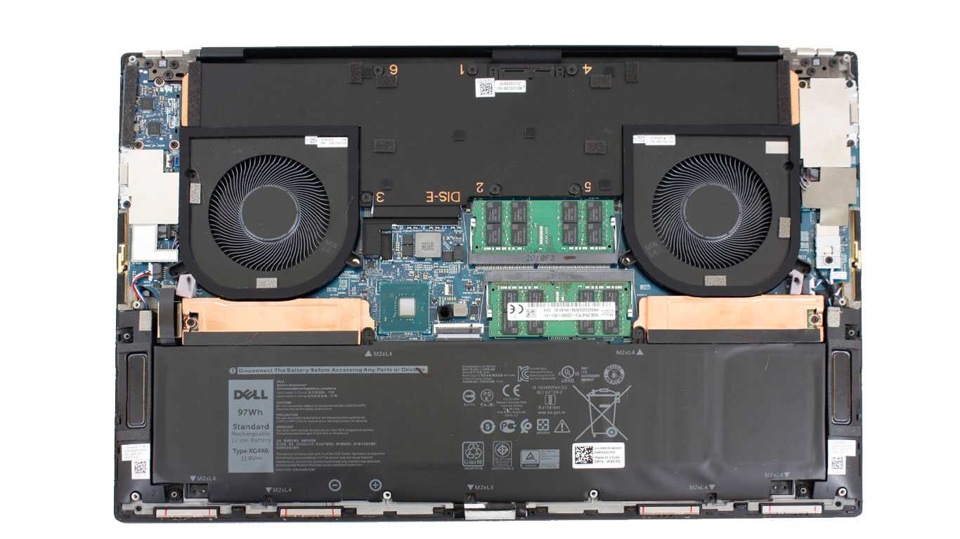 Нижняя крышка выполнена из магниевого сплава. Удерживают ее 8 винтов и защелки по периметру корпуса, снимается она труднее, чем у XPS 15. Внутри имеется два слота M.2 для SSD и два слота для оперативной памяти.