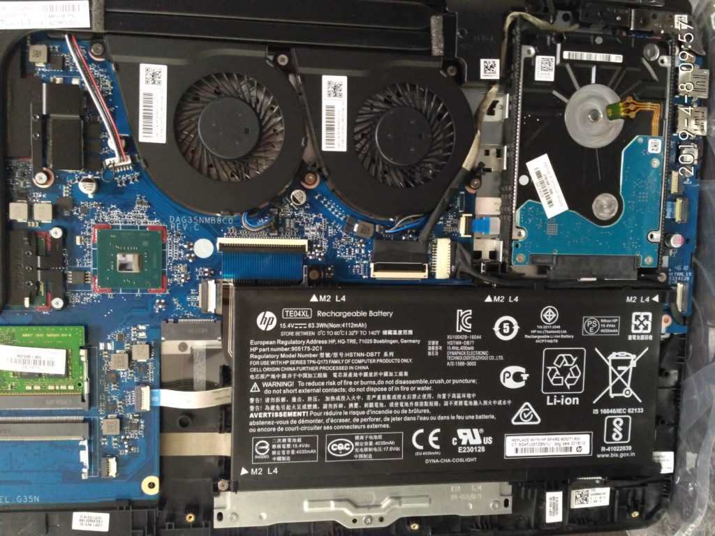 Здесь установлена одна планка оперативной памяти на 8 Гб с возможностью установить еще одну, жесткий диск 2.5″ и аккумуляторная батарея. Так как HP Pavilion 15-bc404ur оснащен игровой двухгиговой видеокартой GeForce GTX 1050 с памятью GDDR5, здесь установлены 2 вентилятора,чтобы обеспечить максимальное охлаждение системы.
