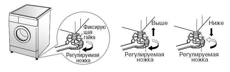 Небольшие неровности полов можно отнивелировать, вращая ключом регулировочную гайку на опорных ножках вправо или влево. Это позволяет изменить их высоту на 1-2 см вверх или вниз.