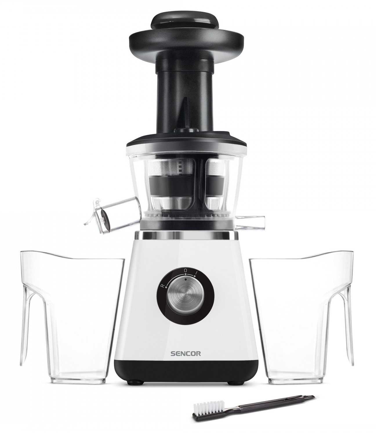 Для сбора жидкости и отработанного жмыха предусмотрен стакан и специальный лоток. Для очистки устройства в комплекте предоставляется специальная щеточка.