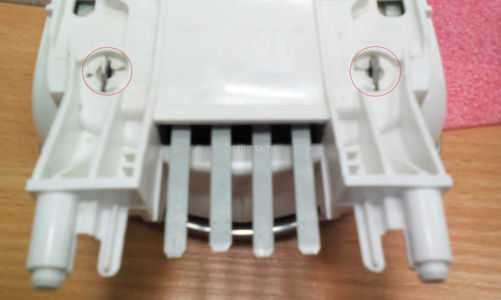 Поверните плоскогубцами фиксаторы в обозначенных на фотографии местах. Поворачивать нужно по часовой стрелке на 90 градусов, пока они не совпадут с пазами в корпусе