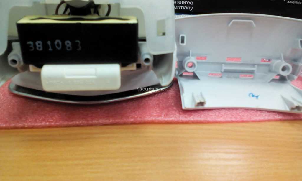 После этого отделите верхнюю часть корпуса от подошвы. На столе останется основание утюжка с надетой на него пластиковой крышкой