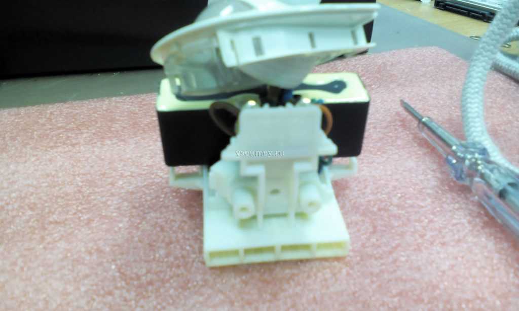 Видим перед собой устройство защитного отключения, это фишка утюга braun texstyle 7. Как заявлено производителем у браун texstyle 7 есть функция автоматического отключения (в горизонтальном положении включенный утюг отключится через 30 секунд, в вертикальном положении отключение произойдёт через 8 минут). Снимаем его.