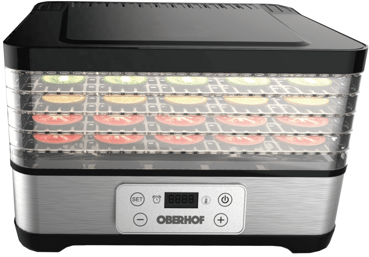 В сушилке Обрехоф предусмотрены разные опции: таймер до 24 часов, регулировка температуры в пределах 35-70 градусов. Управление сенсорное, есть дисплей, где отображаются параметры установленного времени и температуры. Компактный и вместительный дегидратор не занимает много места и пользуется большой популярностью у потребителей.